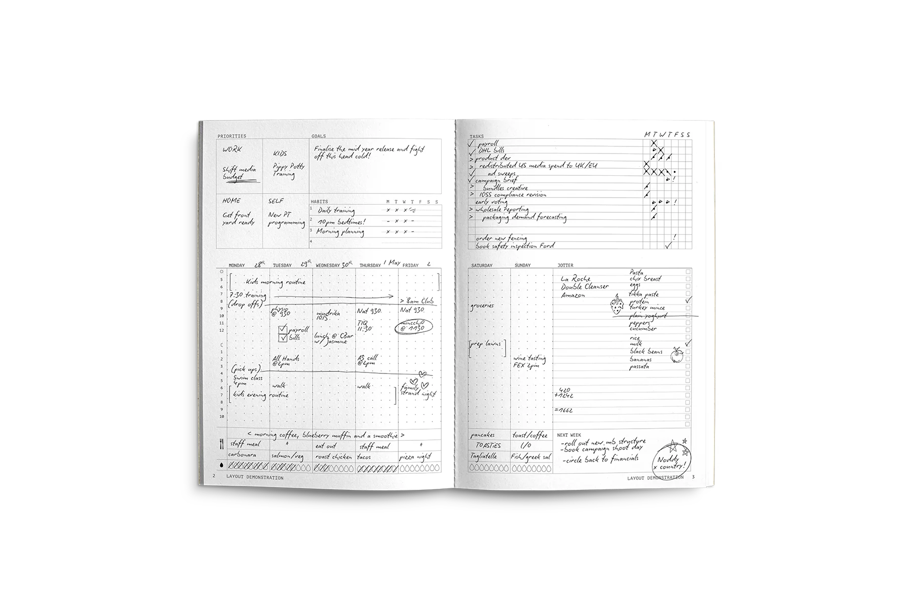 A slim, undated planner for orchestrating your entire week in a single spread. Manage your priorities, schedule, meal plan, habits and tasks all on one layout.Ā