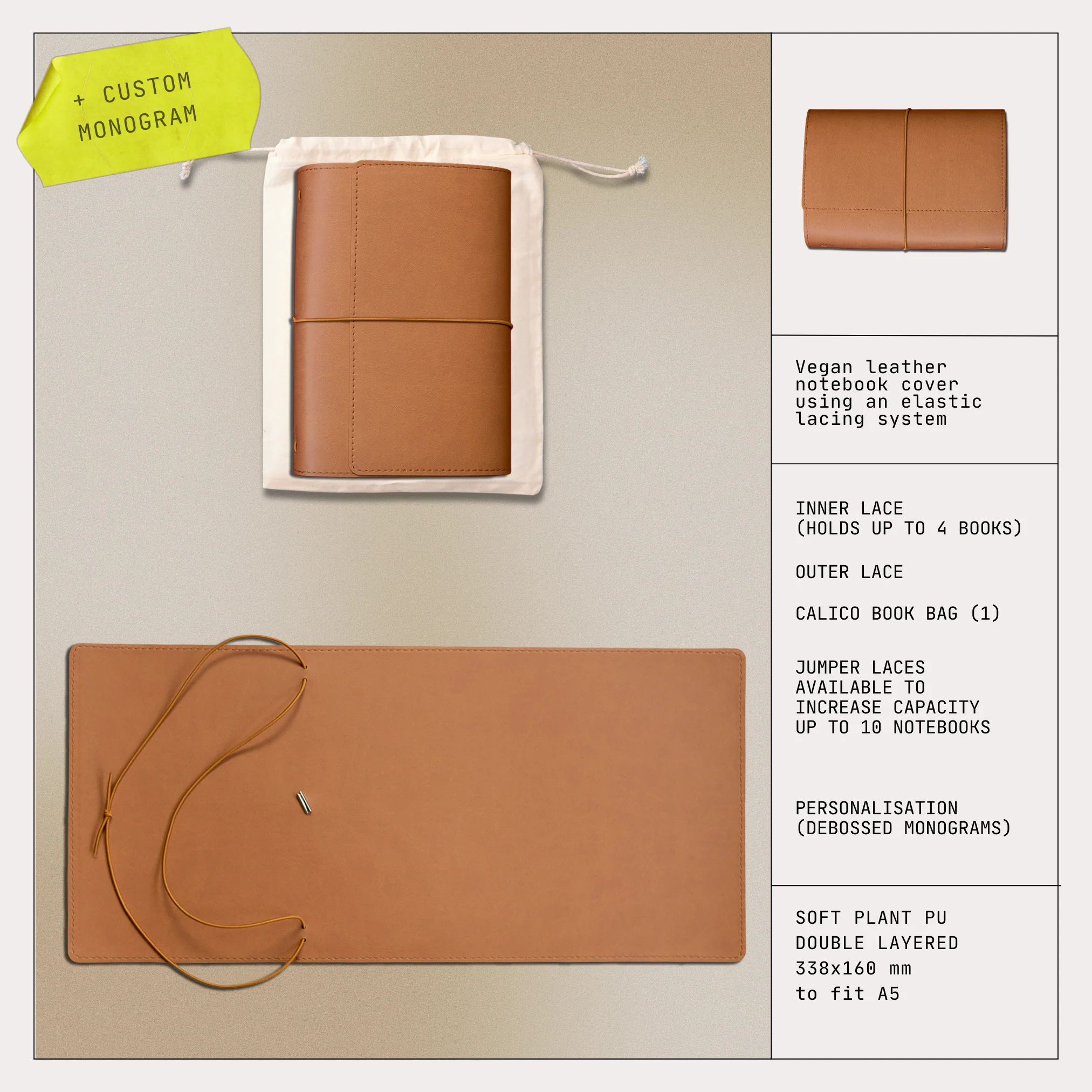 This functional and treasured item is handcrafted from a buttery vegan leather in a selection of timeless colours. It’s fitted with a central elastic lace which can hold up to 4 x A5 notebooks and a secondary closure lace. As with any leather item, over time these covers will not only soften they will scuff and patina to reveal a natural beauty unique to each cover.